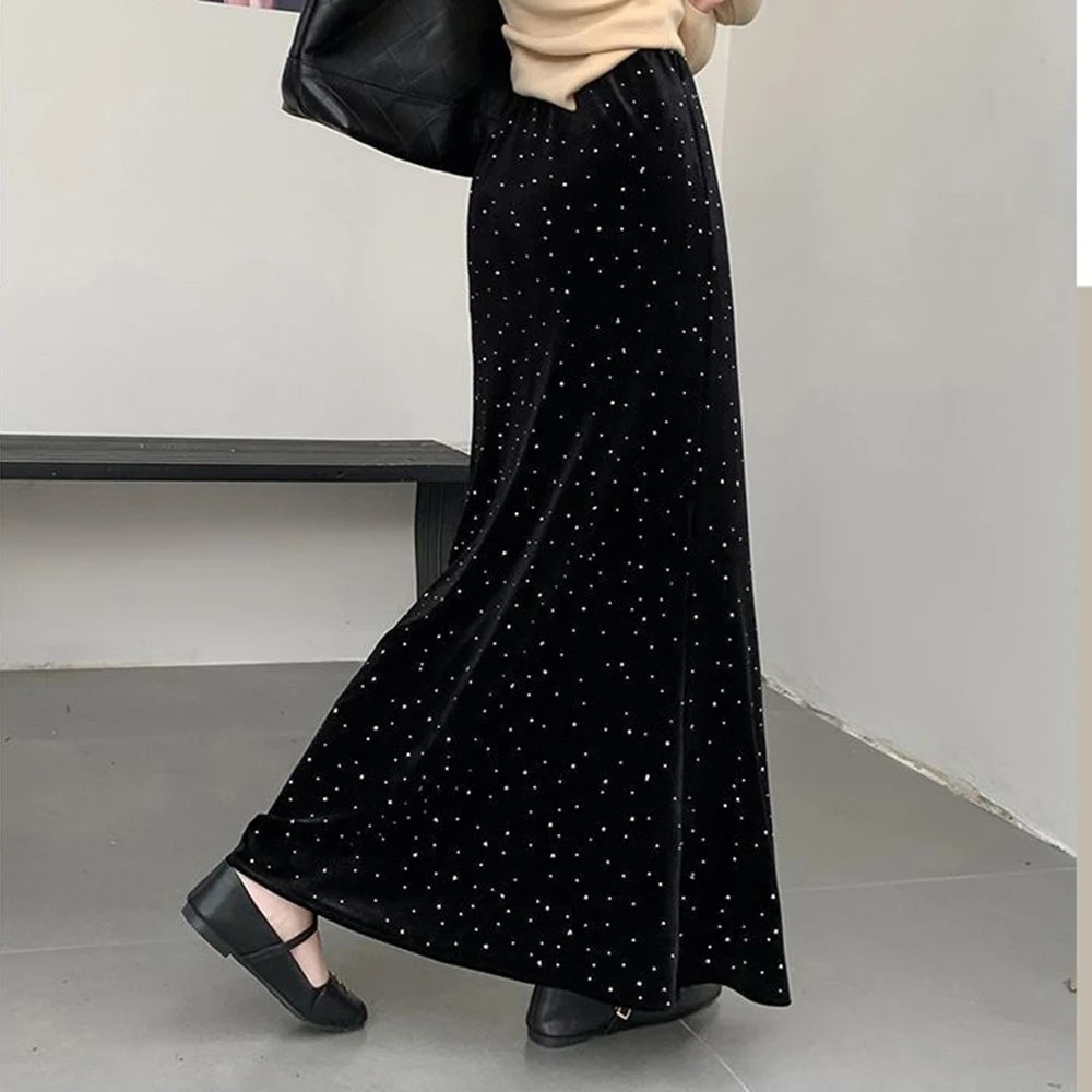 Golden velvet skirt autumn and winter 2025 new high-waisted A-shaped thin hip heavy industry hot diamond fishtail skirt