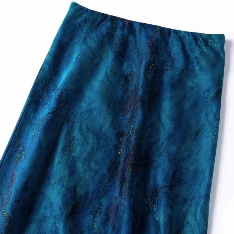 Limiguyue Blue High Waist Satin Skirt Women Flower Print Midi Skirts Casual Slim Silk Fishtail Spring Long Skirt Vintage 537A